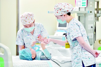 在山東省棗莊市婦幼保健院兒童ICU病房,醫(yī)護(hù)人員為完成靶向治療藥物諾西那生鈉的4歲脊髓性肌萎縮癥患兒加油鼓勁。新華社發(fā)