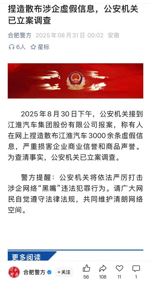 8月31日凌晨,“合肥警方”微信公眾號發(fā)文稱,2025年8月30日下午,公安機(jī)關(guān)接到江淮汽車集團(tuán)股份有限公司報(bào)案,稱有人在網(wǎng)上捏造散布江淮汽車3000余條虛假信息,嚴(yán)重?fù)p害企業(yè)商業(yè)信譽(yù)和商品聲譽(yù)。為查清事實(shí),公安機(jī)關(guān)已立案調(diào)查。