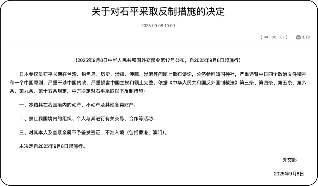 9月8日,中方宣布對日本參議員石平采取反制措施,禁止其進入中國境內(nèi),凍結其在華資產(chǎn),并限制其與中國的商業(yè)往來。