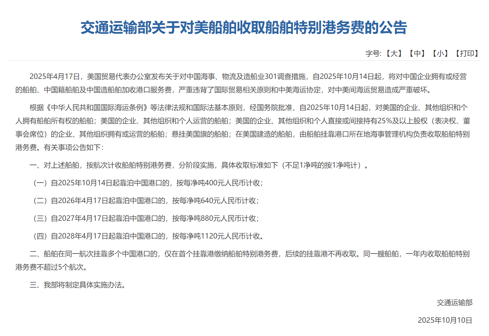 10月10日,交通運(yùn)輸部發(fā)布《交通運(yùn)輸部關(guān)于對美船舶收取船舶特別港務(wù)費(fèi)的公告》(以下簡稱《公告》),決定將于10月14日起對涉美船舶收取船舶特別港務(wù)費(fèi)。