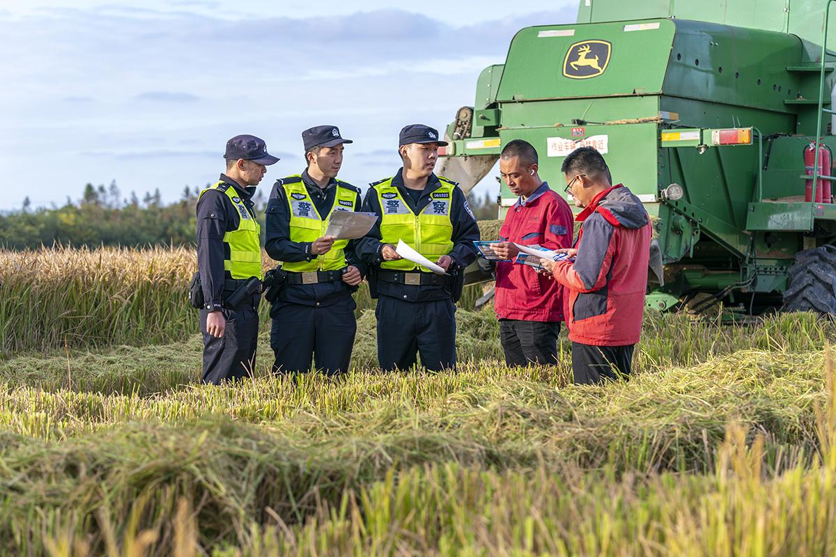 11月11日,上海市公安局崇明分局長(zhǎng)江派出所組織民警走進(jìn)田間地頭,向收割晚稻的農(nóng)戶們開展防盜防騙、交通安全提示等宣防工作。