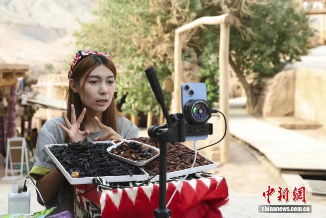 2025年9月9日,新疆鄯善縣吐峪溝景區(qū)商戶在直播賣貨。中新社記者 王紫儒 攝