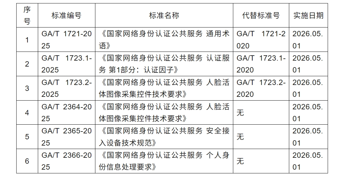《國家網(wǎng)絡(luò)身份認(rèn)證公共服務(wù)管理辦法》已于2025年5月23日發(fā)布,并于7月15日實施。為支撐法規(guī)的落地與實施,近日公安部發(fā)布了2025年第2號《中華人民共和國公安部公共安全行業(yè)標(biāo)準(zhǔn)公告》,國家網(wǎng)絡(luò)身份認(rèn)證公共服務(wù)標(biāo)準(zhǔn)體系中6項公共安全行業(yè)標(biāo)準(zhǔn)正式發(fā)布,于2026年5月1日實施。標(biāo)準(zhǔn)具體內(nèi)容如下: