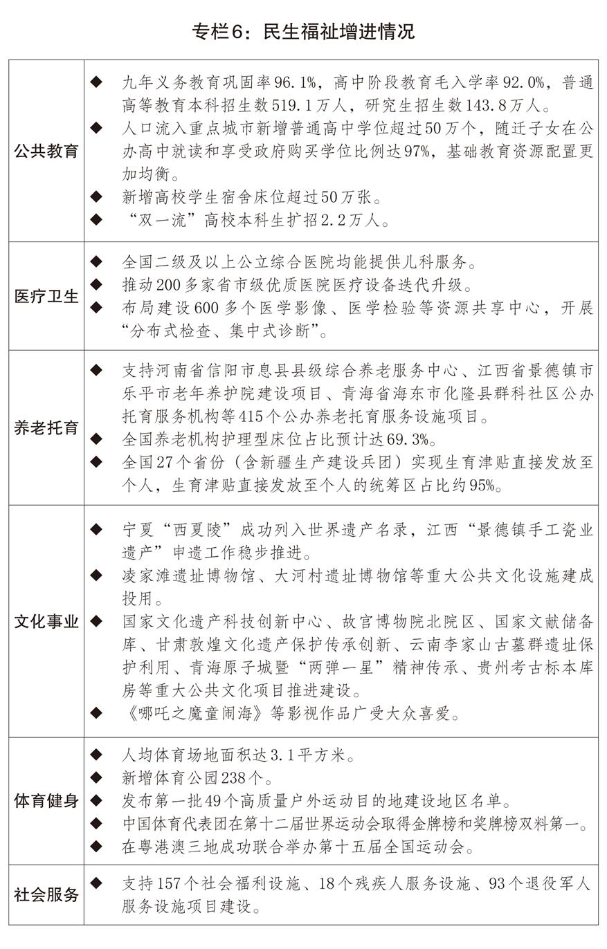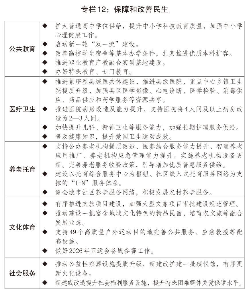 二是構(gòu)建優(yōu)質(zhì)均衡公共服務(wù)體系。穩(wěn)步推進基本公共服務(wù)均等化。適應(yīng)學(xué)齡人口變化,優(yōu)化學(xué)前和義務(wù)教育資源配置,增加普通高中學(xué)位供給和優(yōu)質(zhì)高校本科招生。全面推進健康學(xué)校建設(shè)。深化實施醫(yī)療衛(wèi)生強基工程,完善國家區(qū)域醫(yī)療中心管理體制和運行機制,促進優(yōu)質(zhì)醫(yī)療資源擴容下沉和區(qū)域均衡布局,加強縣區(qū)、基層醫(yī)療機構(gòu)運行保障。支持心理健康和精神衛(wèi)生、婦女兒童健康服務(wù)體系建設(shè),實施康復(fù)護理擴容提升工程。健全公共衛(wèi)生防控救治體系。加強慢性病、罕見病防治,全方位提升急診急救、血液保障和應(yīng)急能力。推進中醫(yī)藥傳承創(chuàng)新,促進中西醫(yī)結(jié)合。推出促進銀發(fā)經(jīng)濟高質(zhì)量發(fā)展的增量政策,培育發(fā)展銀發(fā)經(jīng)濟龍頭企業(yè),推進老年人力資源開發(fā),更好滿足老年人多元化需求。發(fā)展醫(yī)養(yǎng)結(jié)合服務(wù),推行長期護理保險,健全失能失智老年人照護體系。實施早孕關(guān)愛行動、孕育和出生缺陷防治能力提升計劃。發(fā)揮育兒補貼作用,完善生育保險、生育休假等制度。推進普惠養(yǎng)老托育服務(wù)體系建設(shè),提升社區(qū)養(yǎng)老托育等服務(wù)能力。加強公共設(shè)施適老化和無障礙改造。推進高質(zhì)量戶外運動目的地建設(shè),開展群眾身邊體育運動空間擴容。積極培育群眾賽事。深化家政產(chǎn)教融合,持續(xù)推進家政服務(wù)業(yè)提質(zhì)擴容。完善困境兒童服務(wù)保障體系,支持社會福利設(shè)施建設(shè)。