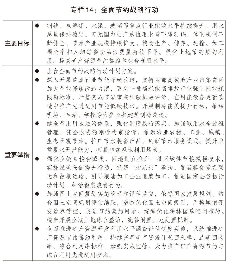 三是加快形成綠色生產(chǎn)生活方式。開展全面節(jié)約戰(zhàn)略行動,持續(xù)推動“能水糧地礦材”一體化節(jié)約。推動修訂節(jié)約能源法,修訂重點用能和碳排放單位管理辦法,開展制冷能效提升和綠色照明行動,推行公共機構(gòu)能源費用托管等市場化節(jié)能模式。深化節(jié)水型社會建設(shè),擴大非常規(guī)水利用規(guī)模,大力發(fā)展節(jié)水產(chǎn)業(yè)。大力開展糧食節(jié)約和反食品浪費行動。發(fā)展循環(huán)經(jīng)濟,提高垃圾分類和資源化利用水平,加快構(gòu)建廢棄物循環(huán)利用體系,加強再生材料推廣使用。支持氧化鋁提鋰提鎵。支持“以竹代塑”產(chǎn)業(yè)發(fā)展。設(shè)立國家低碳轉(zhuǎn)型基金,培育氫能、綠色燃料等新增長點。健全綠色消費激勵機制,推廣綠色低碳生活方式。