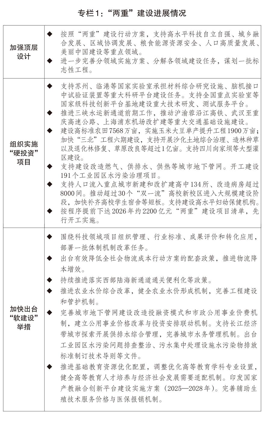 二是“兩重”建設(shè)接續(xù)推進。強化“兩重”性質(zhì)、堅持自上而下、注重軟硬結(jié)合,高質(zhì)量推進國家重大戰(zhàn)略和重點領(lǐng)域安全能力項目建設(shè)。加快“硬投資”項目實施,安排超長期特別國債8000億元,支持1459個重大項目,督促加快開工建設(shè),推動形成更多實物工作量。建立超長期貸款配套支持“兩重”建設(shè)工作機制,加大項目融資支持力度。加力推進規(guī)劃編制、政策制定、體制機制創(chuàng)新等“軟建設(shè)”配套措施,完善項目投融資和價費、工程建設(shè)管理和運行管護等機制。