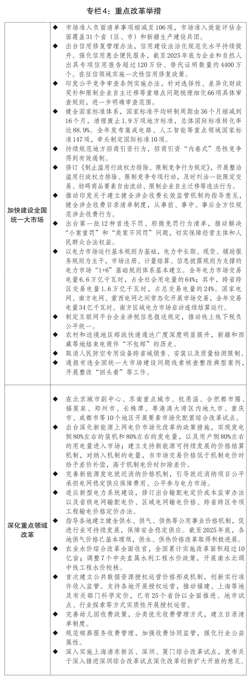 一是全國統(tǒng)一大市場建設(shè)向縱深推進。實施全國統(tǒng)一大市場建設(shè)指引,出臺市場準入負面清單(2025年版),清單事項縮減至106項。深入開展市場準入壁壘清理整治行動,累計修訂或廢止相關(guān)文件2300余件。加快建設(shè)統(tǒng)一開放的交通運輸市場,實施交通物流降本提質(zhì)增效行動計劃,市場設(shè)施聯(lián)通更加高效順暢。推動修訂反不正當(dāng)競爭法,出臺公平競爭審查條例實施辦法,開展整治濫用行政權(quán)力排除、限制競爭專項行動。持續(xù)規(guī)范地方招商引資行為,招商引資亂象得到有效遏制,地方制定實施政策的合規(guī)意識明顯增強。出臺健全社會信用體系的意見,構(gòu)建信用修復(fù)制度,建立企業(yè)信用狀況綜合評價體系,全面推行以專項信用報告替代有無違法違規(guī)記錄證明。全國統(tǒng)一電力市場體系初步建立,跨電網(wǎng)經(jīng)營區(qū)常態(tài)化電力交易機制基本建立,電力現(xiàn)貨市場基本覆蓋全國。