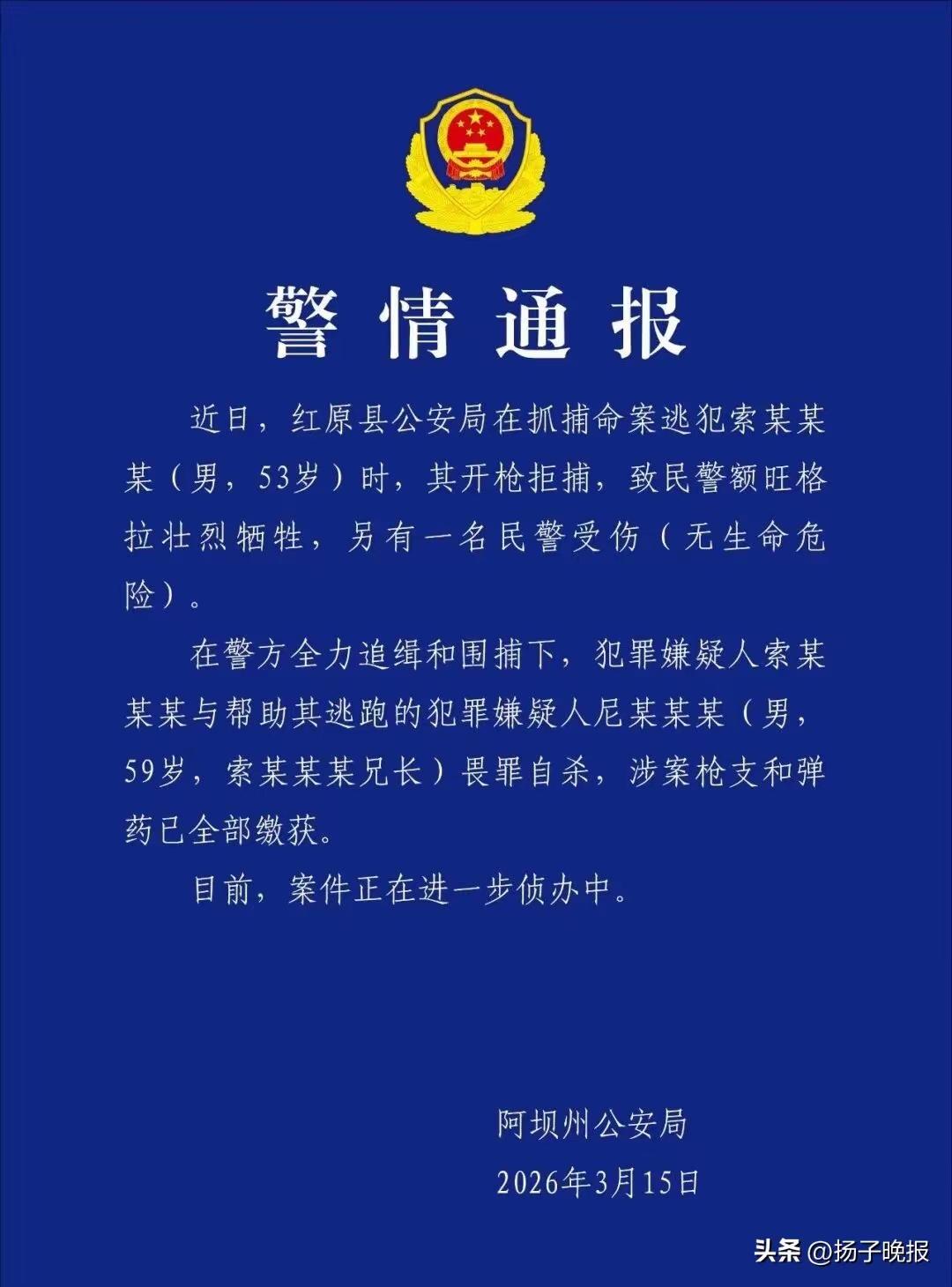 3月15日晚,四川阿壩州公安局發(fā)布警情通報:近日,紅原縣公安局在抓捕命案逃犯索某某某(男,53歲)時,其開槍拒捕,致民警額旺格拉壯烈犧牲,另有一名民警受傷(無生命危險)。