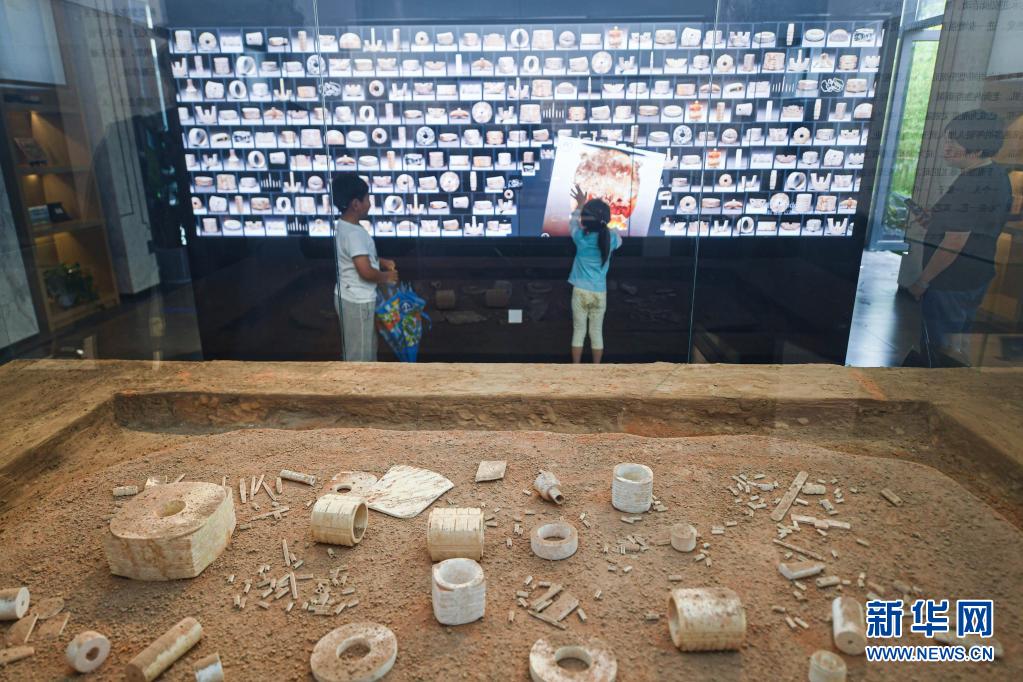 2020年6月6日,小游客在浙江省杭州市余杭區(qū)瓶窯老街的“良渚玉雕館”內(nèi)通過電子屏學(xué)習(xí)玉雕知識(shí)。新華社記者 徐昱 攝