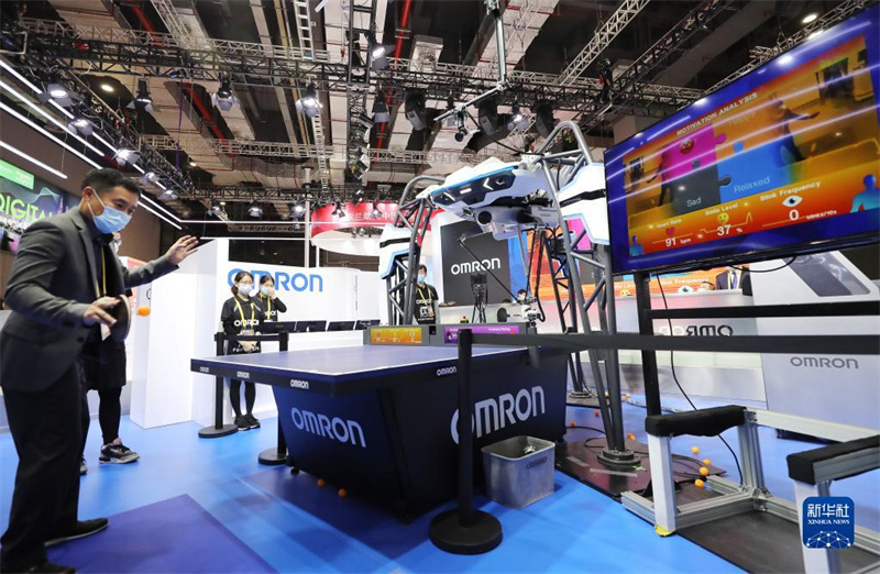 在第三屆中國國際進口博覽會期間,一名男子體驗與歐姆龍公司的一款乒乓球教練機器人對戰(zhàn),右側(cè)屏幕上實時顯示他的心率和情緒指數(shù)(2020年11月5日攝)。新華社記者 方喆 攝
