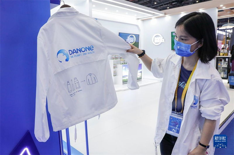 工作人員在第四屆中國國際進口博覽會食品和農(nóng)產(chǎn)品展區(qū)達能展臺展示用塑料飲料空瓶制造的外套(2021年11月6日攝)。新華社記者 張玉薇 攝