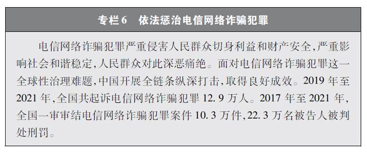 加大網(wǎng)絡(luò)犯罪懲治力度。隨著互聯(lián)網(wǎng)技術(shù)的快速發(fā)展,傳統(tǒng)犯罪加速向以互聯(lián)網(wǎng)為媒介的非接觸式犯罪轉(zhuǎn)變,電信網(wǎng)絡(luò)詐騙、網(wǎng)絡(luò)賭博、網(wǎng)絡(luò)淫穢色情等涉網(wǎng)違法犯罪多發(fā)。中國依法辦理新型網(wǎng)絡(luò)犯罪案件。連續(xù)多年開展“凈網(wǎng)行動”,嚴厲打擊群眾反映強烈的黑客攻擊破壞、侵犯公民個人信息等違法犯罪活動。持續(xù)推進“云劍”“斷卡”“斷流”“拔釘”等專項行動,打擊套路貸、校園貸、“以房養(yǎng)老”、“投資養(yǎng)老”等電信網(wǎng)絡(luò)詐騙犯罪,依法懲處為電信網(wǎng)絡(luò)詐騙犯罪團伙提供互聯(lián)網(wǎng)接入、域名注冊、服務器托管、移動互聯(lián)網(wǎng)應用程序制作開發(fā)、網(wǎng)絡(luò)支付、引流推廣等服務支撐的黑灰產(chǎn)業(yè)。完善國家反詐大數(shù)據(jù)平臺和反詐移動互聯(lián)網(wǎng)應用程序,建設(shè)國家涉詐黑樣本庫,完善快速止付凍結(jié)機制、涉詐資金返還機制。堅決打擊網(wǎng)絡(luò)賭博犯罪行為,從嚴治理網(wǎng)絡(luò)淫穢色情。網(wǎng)絡(luò)犯罪治理工作取得明顯成效,人民群眾安全感有效提升,社會更加和諧穩(wěn)定。
