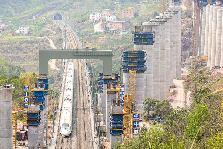 2025年3月27日,在成達(dá)萬高鐵左線福壽跨渝萬城際特大橋項(xiàng)目施工現(xiàn)場,成達(dá)萬高鐵首個跨既有高鐵鋼橫梁吊裝完成,鄭渝高鐵線上一列動車從門式墩鋼橫梁下通過。新華社發(fā)(黃茂程攝)