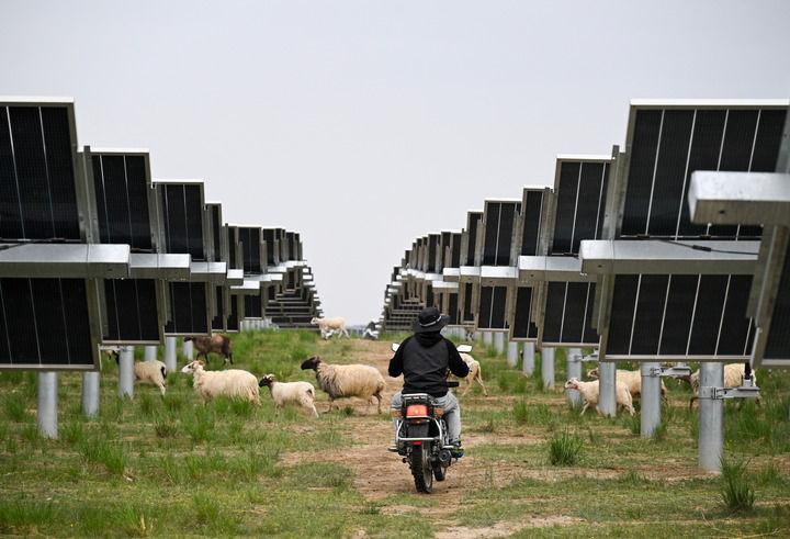 2025年6月18日,牧民在位于青海省海南藏族自治州的青海黃河上游水電開發(fā)有限責(zé)任公司共和光伏產(chǎn)業(yè)園放羊。該光伏產(chǎn)業(yè)園推廣“光伏+生態(tài)”模式,將昔日荒灘變成牧場。新華社記者 金良快 攝