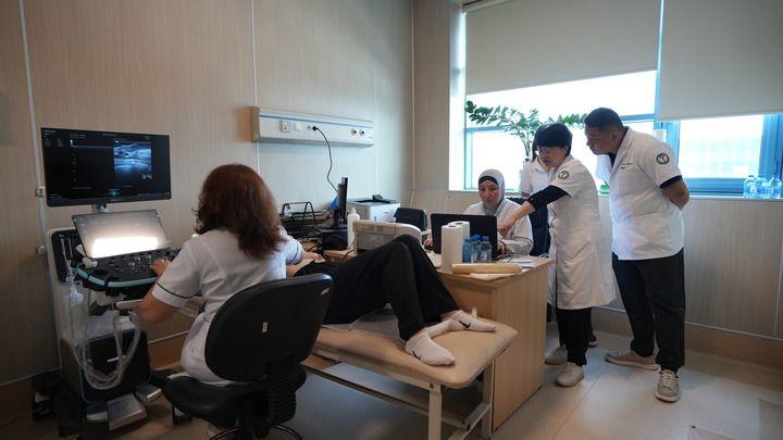 7月16日,天津市抗癌協(xié)會(huì)、天津醫(yī)科大學(xué)腫瘤醫(yī)院的醫(yī)療隊(duì)專家在阿塞拜疆與當(dāng)?shù)蒯t(yī)院的超聲醫(yī)生聯(lián)合開(kāi)展乳腺癌篩查。宋瑞 攝