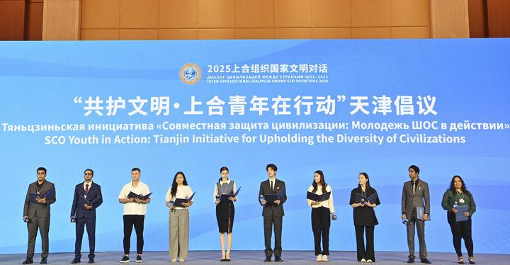 這是在2025上合組織國(guó)家文明對(duì)話(huà)現(xiàn)場(chǎng)拍攝的“共護(hù)文明·上合青年在行動(dòng)”天津倡議發(fā)布環(huán)節(jié)(2025年7月23日攝)。新華社記者 李然 攝
