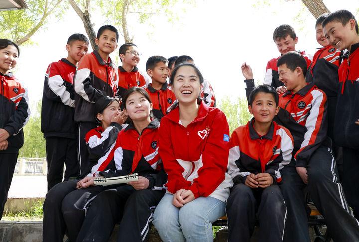 在新疆阿圖什市哈拉峻鄉(xiāng)謝依特小學(xué),支教教師高淑賢和學(xué)生們在一起(2025年4月23日攝)。新華社記者 王菲 攝