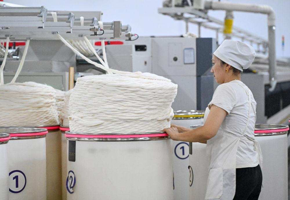 2024年7月4日,新疆克孜勒蘇柯?tīng)柨俗巫灾沃菀患壹徔椘髽I(yè)的工人在紡紗車(chē)間工作。棉花和紡織服裝產(chǎn)業(yè)已成為新疆重要的民生產(chǎn)業(yè)和支柱產(chǎn)業(yè)。近年來(lái),克孜勒蘇柯?tīng)柨俗巫灾沃莅D什市以棉紡織業(yè)為引領(lǐng),積極招商引資,打造集紡紗、織布以及高端紡織品研發(fā)為一體的大型紡織產(chǎn)業(yè)園區(qū),為周邊鄉(xiāng)鎮(zhèn)群眾提供1500余個(gè)就業(yè)崗位。