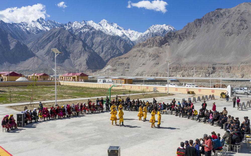 2020年6月6日,新疆塔什庫(kù)爾干塔吉克自治縣文工團(tuán)演員在達(dá)布達(dá)爾鄉(xiāng)的一個(gè)山村為村民表演舞蹈節(jié)目(無(wú)人機(jī)照片)。塔縣文工團(tuán)成立于1956年,現(xiàn)有工作人員100余人,是活躍于新疆帕米爾高原上的“文藝輕騎兵”。在自然環(huán)境嚴(yán)酷的高原,塔縣文工團(tuán)演員們常年堅(jiān)持送文化進(jìn)山村、到牧場(chǎng),宣講惠民政策,用文藝演出豐富村民的精神文化生活。