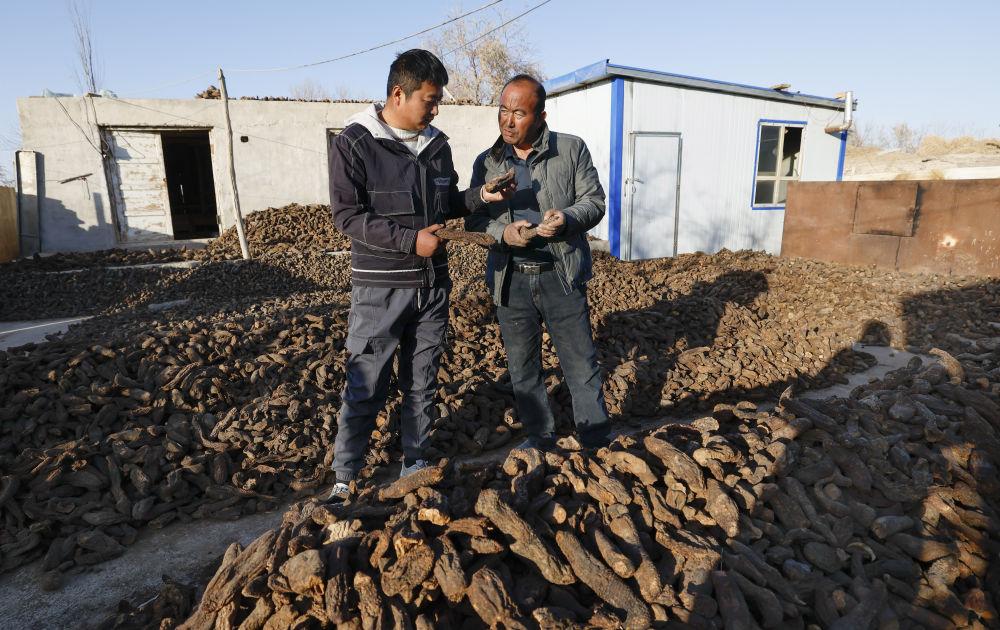 2024年12月4日,新疆民豐縣尼雅鎮(zhèn)甫甫克村村民麥麥提(右)同前來(lái)收購(gòu)大蕓的商戶(hù)交流。自20世紀(jì)末新疆全面開(kāi)展防風(fēng)治沙工程并大力推進(jìn)沙產(chǎn)業(yè)以來(lái),麥麥提從在合作社挖大蕓賺工錢(qián),到后來(lái)主動(dòng)學(xué)習(xí)大蕓種植技術(shù)并創(chuàng)業(yè),一路走來(lái)小有收獲。2018年,他承包了10畝沙地種紅柳、大蕓。紅柳茁壯成長(zhǎng),大蕓產(chǎn)量頗豐,麥麥提年收入超過(guò)5萬(wàn)元。