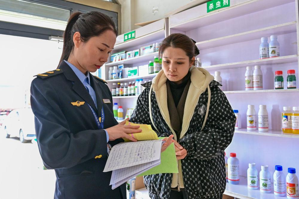 2024年3月21日,新疆阿克蘇市農(nóng)業(yè)綜合行政執(zhí)法大隊(duì)的執(zhí)法人員在阿克蘇市農(nóng)資市場(chǎng)查看農(nóng)資經(jīng)銷(xiāo)部的銷(xiāo)售臺(tái)賬。