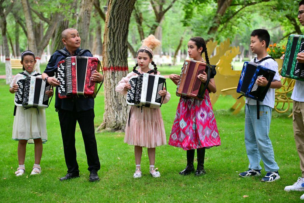 2024年7月24日,在新疆塔城市文化廣場(chǎng),手風(fēng)琴文化傳承中心老師道吾然·對(duì)山漢(左二)帶領(lǐng)學(xué)生練習(xí)手風(fēng)琴。塔城市居住著漢族、哈薩克族、回族、維吾爾族、蒙古族、塔塔爾族、俄羅斯族等20多個(gè)民族,是一片多元文化沃土。手風(fēng)琴是塔城市民間最廣為流傳的樂(lè)器,也是各族人民文化交流的重要媒介。近年來(lái),塔城市深入挖掘手風(fēng)琴文化,舉辦多場(chǎng)手風(fēng)琴文化藝術(shù)節(jié)活動(dòng),為各民族文化交流提供平臺(tái)。