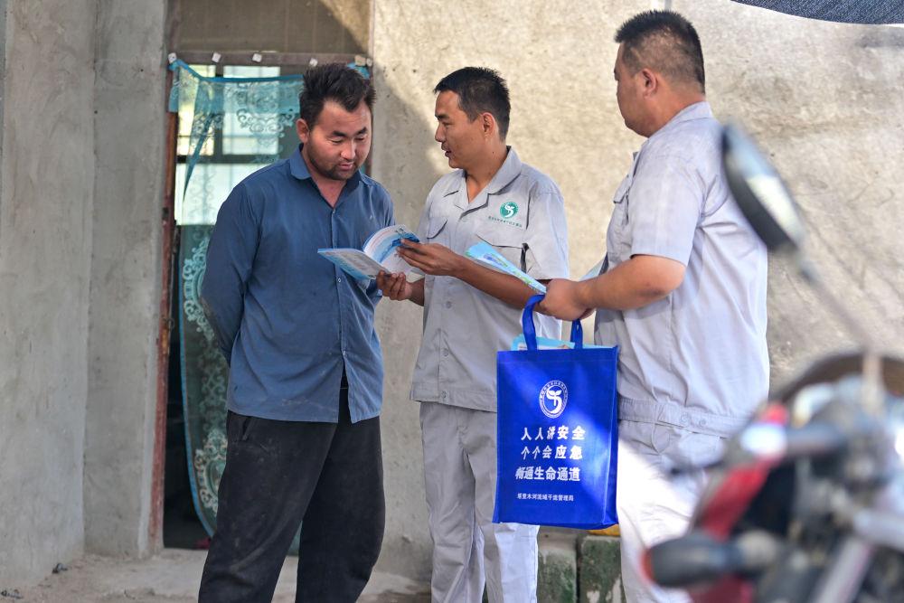 2024年8月13日,在新疆塔里木河尉犁段,新疆塔里木河流域干流管理局烏斯?jié)M管理站副站長(zhǎng)才登巴(中)與同事宋志偉入戶(hù)宣傳法律法規(guī)。