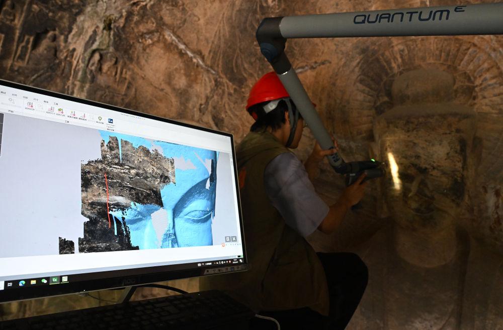 2025年4月9日,武漢大學文化遺產智能計算實驗室團隊成員在河南洛陽龍門石窟魏字洞使用關節(jié)臂掃描儀對佛像進行數字化掃描。從2005年起,龍門石窟研究院開始為龍門石窟建立數字化檔案,借助激光掃描、高清攝影等技術手段收集文物數據,以數字的形式留存千年石刻群的風貌,致力于讓這一規(guī)模宏大、氣勢磅礴的石窟瑰寶“芳華永駐”。