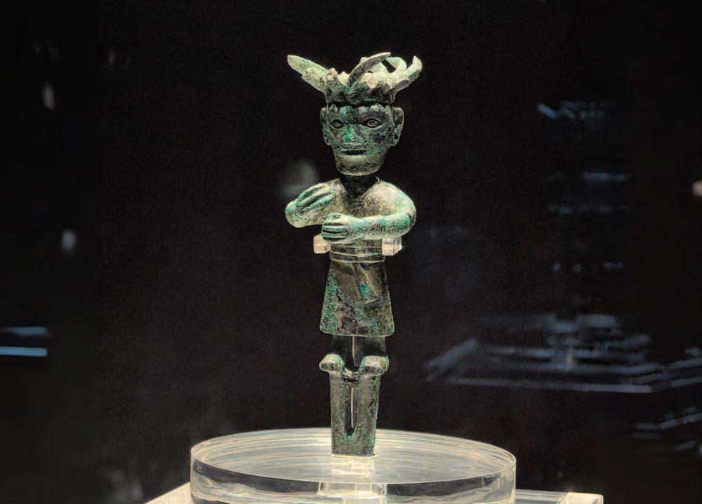 金沙遺址出土的銅立人,造型與三星堆青銅大立人相似(2025年4月9日攝)。三星堆遺址和金沙遺址都位于四川,距今約3600年至2800年,作為古蜀文明的兩個中心遺址,共同勾勒出古蜀文明前后相繼的輝煌圖景,其出土文物是中華文明多元一體的生動例證。