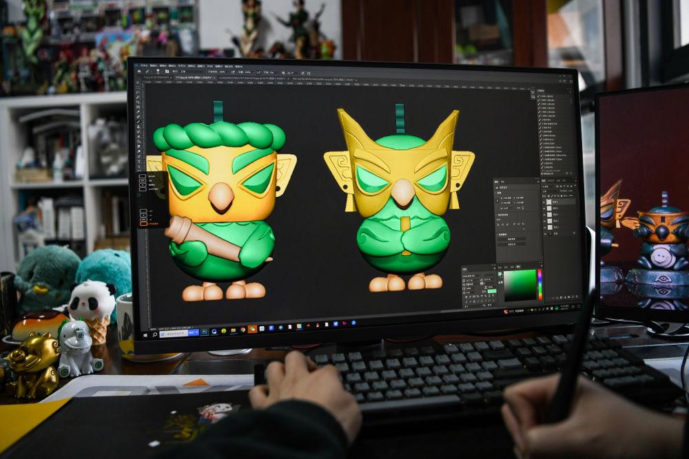 2025年3月1日,文創(chuàng)產(chǎn)品策劃運營師曾舟在位于四川成都的辦公室內完善文創(chuàng)產(chǎn)品細節(jié)。他以三星堆青銅神樹、青銅縱目面具、青銅獸面等文物為創(chuàng)作藍本,結合潮玩元素設計的文創(chuàng)作品廣受歡迎?!拔蚁胱龅牟皇峭婢呖煜罚怯袃热?、有溫度、有意義的文化IP,讓年輕一代隨手摸到沉淀千年的文化?!痹壅f。
