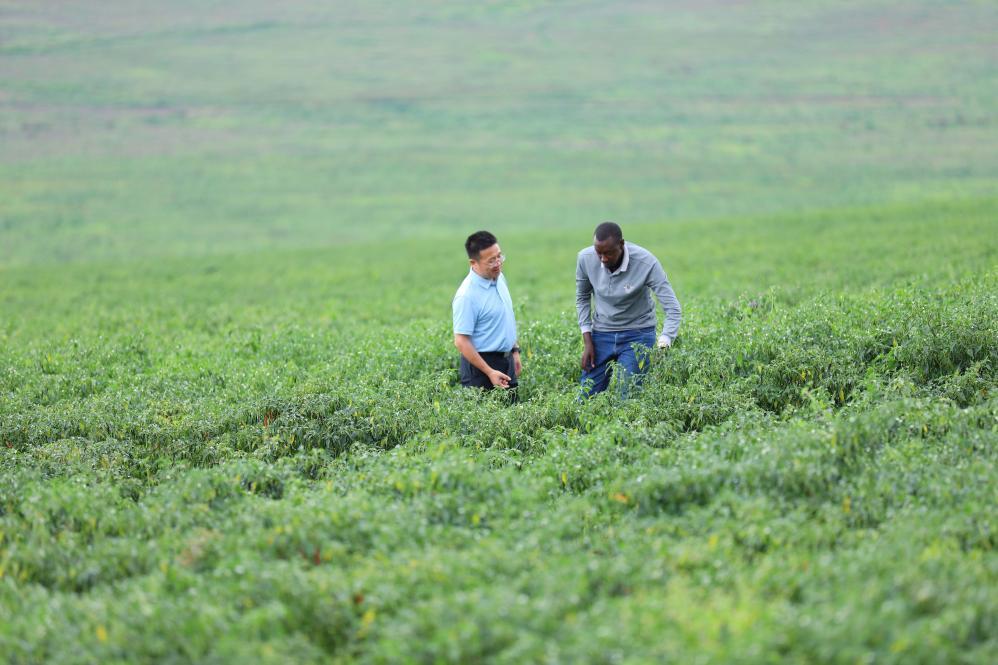 2025年5月22日,在盧旺達(dá)加紹拉農(nóng)場,湘農(nóng)國際非洲商務(wù)代表與當(dāng)?shù)剞r(nóng)業(yè)技術(shù)員查看辣椒長勢。新華社記者吉莉攝