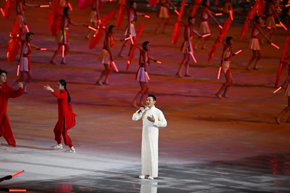 當(dāng)《海闊天空》的旋律響起,觀眾席上的數(shù)萬人自發(fā)點(diǎn)亮手機(jī)燈光,齊聲合唱。象征第十五屆全運(yùn)會(huì)的15朵巨型木棉花升空,香港藝人劉德華領(lǐng)唱《中國(guó)人》,全場(chǎng)沸騰。