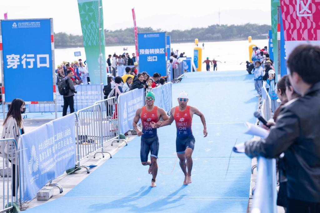 ↑11月27日,廣東一團(tuán)選手石金飛(中)與引導(dǎo)員楊奧富在跑步比賽中沖刺