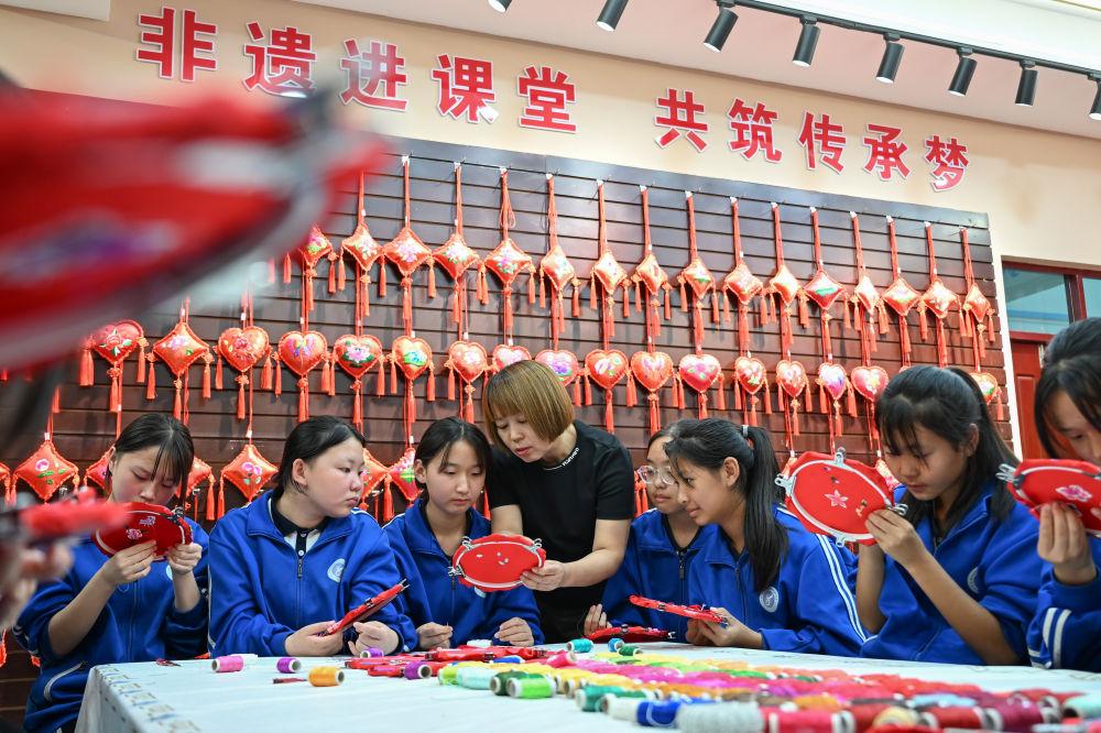 2025年9月26日,內(nèi)蒙古興安盟科右中旗巴彥呼舒第六中學美術教師、非遺傳承人吳斯琴(左四)指導學生刺繡。近年來,學校將當?shù)貒壹壏沁z圖什業(yè)圖刺繡引入校園,開設課程,并成立興趣社團,讓學生們近距離感受非遺的魅力,弘揚和傳承傳統(tǒng)文化。