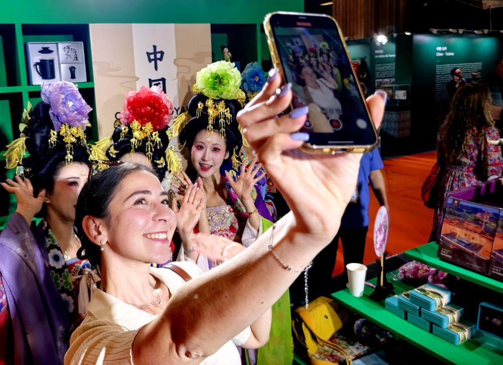 2025年4月30日,以“中國風·中國潮”為主題的“遇鑒中國”2025中華文化主題展亮相當天開幕的法國巴黎博覽會。這是參觀者與唐代仕女妝造的中方參展人員在巴黎博覽會上合影。