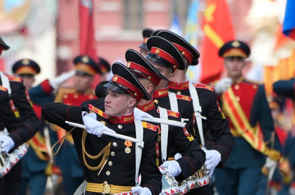 2025年5月9日,在俄羅斯首都莫斯科,軍樂隊(duì)參加紀(jì)念蘇聯(lián)偉大衛(wèi)國(guó)戰(zhàn)爭(zhēng)勝利80周年閱兵式。新華社記者 賴向東 攝