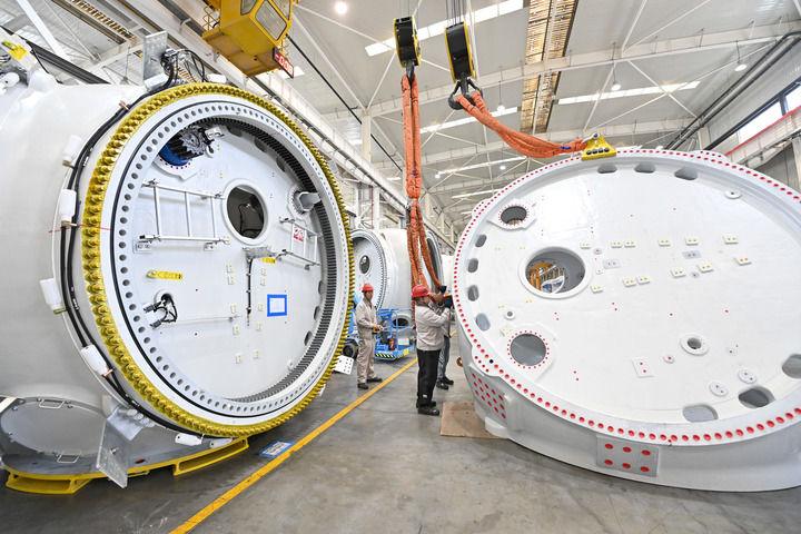 2025年9月24日,工人在位于山西轉(zhuǎn)型綜合改革示范區(qū)的太重集團(tuán)新能源產(chǎn)業(yè)園區(qū)吊運(yùn)風(fēng)電裝備。新華社記者 楊晨光 攝