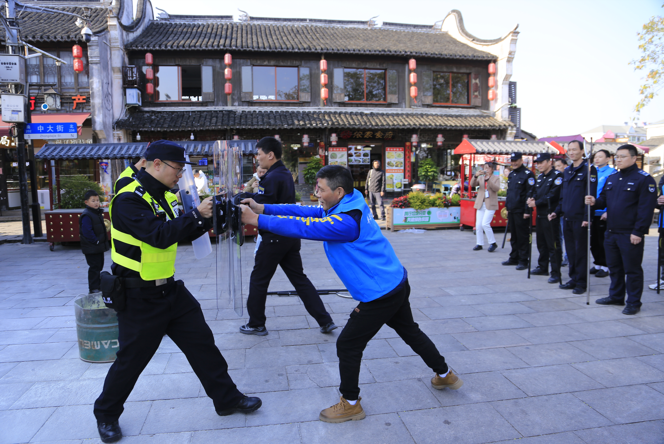 公安指導(dǎo)商戶們進(jìn)行應(yīng)急處突演練