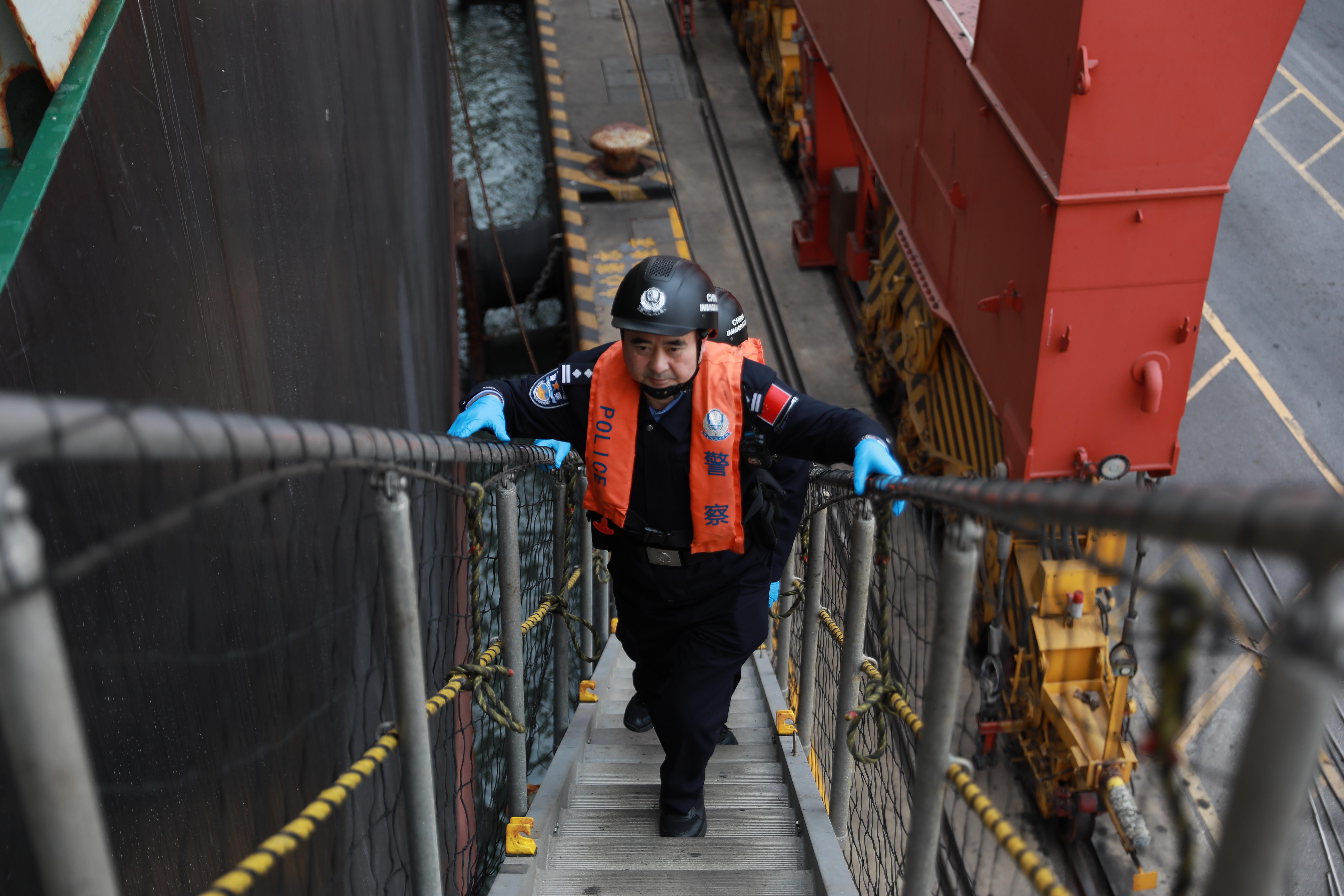 “臨近年關(guān),各家進(jìn)出口企業(yè)都在搶訂單、搶市場、搶時間,國際大宗商品物流加速,國內(nèi)年貨市場供需兩旺,加上遠(yuǎn)洋船舶的船員換班潮,這段時間是碼頭最熱鬧的時候?!焙陀浾咭煌哌M(jìn)港區(qū)的是該站執(zhí)勤三隊民警王京義。