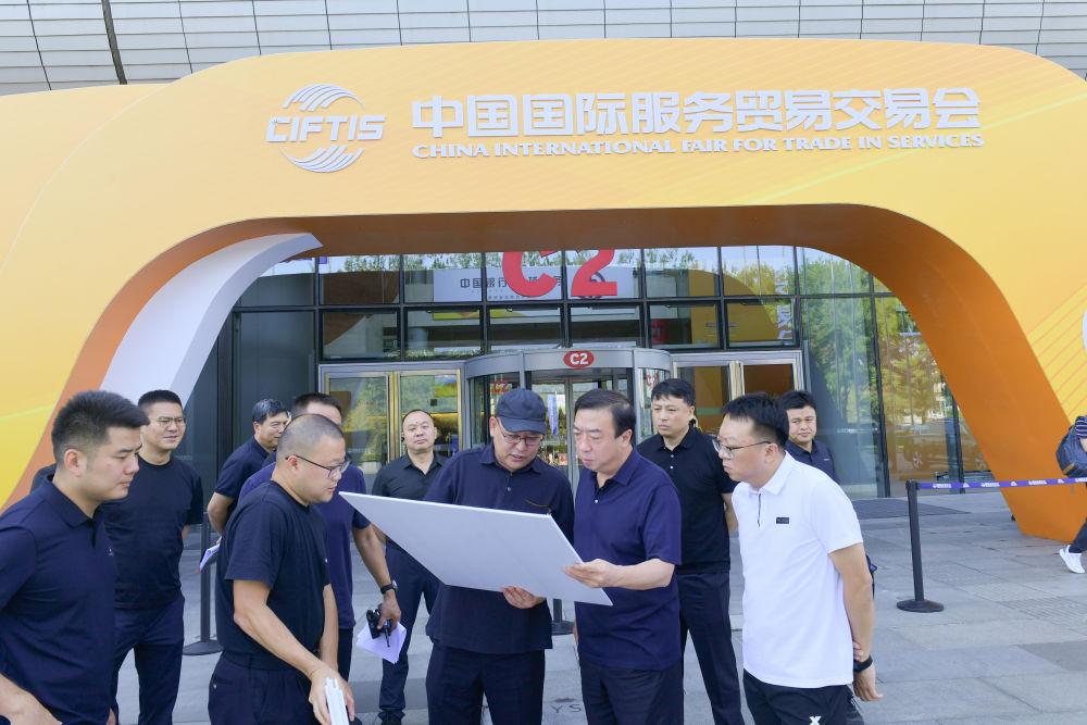 2023年8月28日,董亦軍同志(前右二)在中國(guó)國(guó)際服務(wù)貿(mào)易交易會(huì)舉辦地,對(duì)交通服務(wù)保障工作進(jìn)行現(xiàn)場(chǎng)踏勘。新華社發(fā)