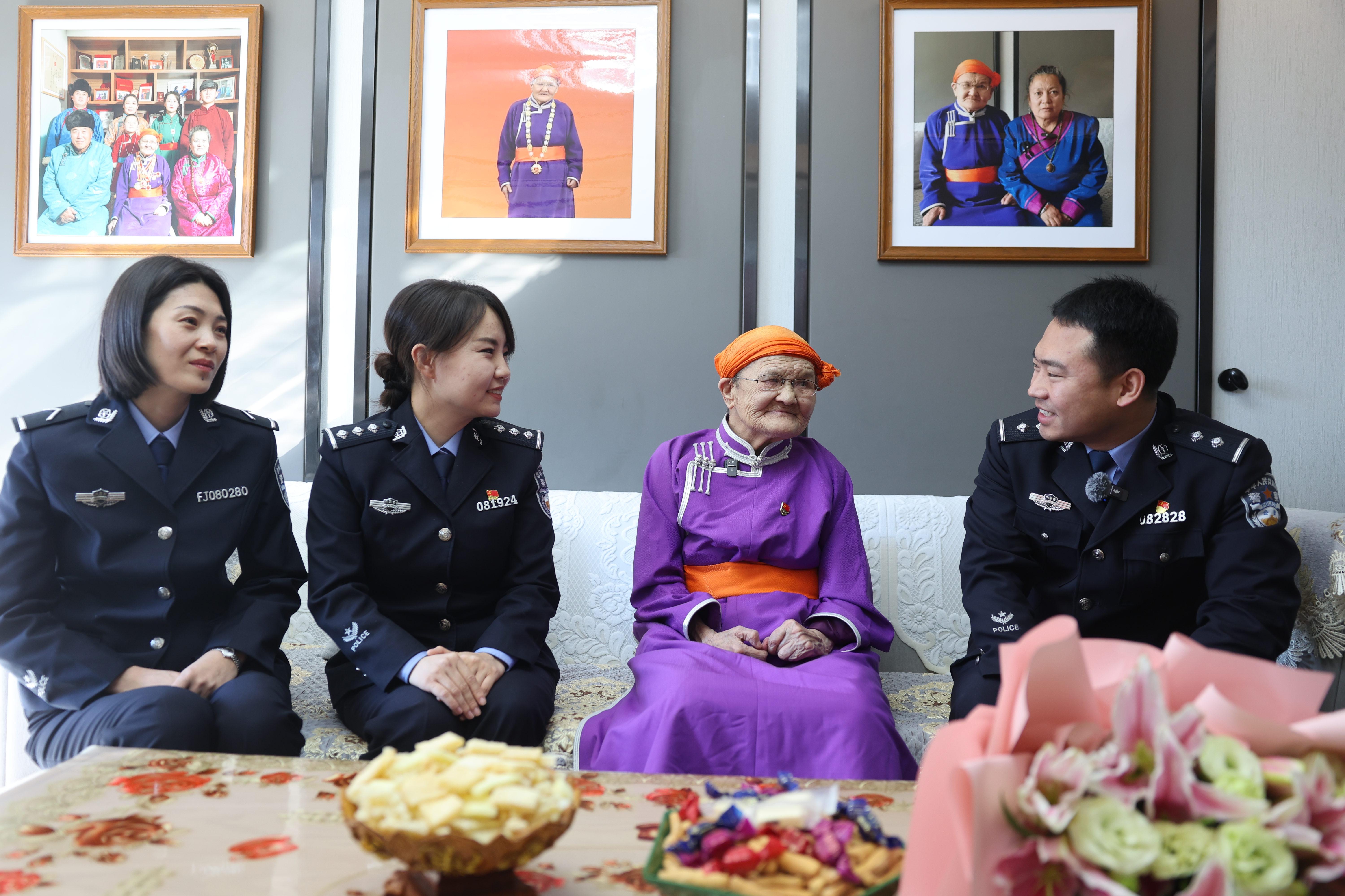 圖為錫林郭勒盟公安局民輔警走訪(fǎng)都貴瑪老人。