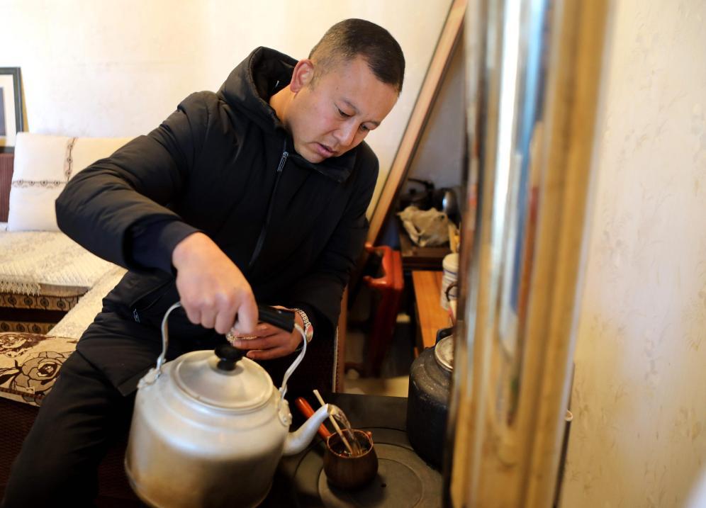 臨近中午,屋里爐子上茶水沸騰,發(fā)出“咕嘟嘟”的聲響。馬海龍回到家,掃地、擦窗。當?shù)亓曀?,農(nóng)歷小年要“掃房”,寓意辭舊迎新。