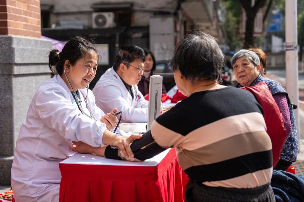 3月5日,在長(zhǎng)沙市望城區(qū)高塘嶺街道雷鋒路社區(qū)雷鋒驛站,志愿者(左一)為市民測(cè)量血壓。新華社記者 陳思汗 攝