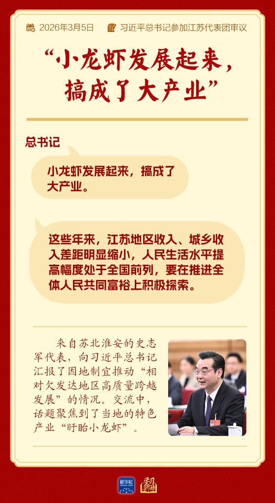話題聚焦到了當(dāng)?shù)氐奶厣a(chǎn)業(yè)“盱眙小龍蝦”。當(dāng)?shù)嘏嘤龅男↓埼r新品種“盱眙1號”,體重、畝產(chǎn)均提高18%以上,很受市場歡迎。盱眙的農(nóng)村居民32.5%的收入來自小龍蝦。