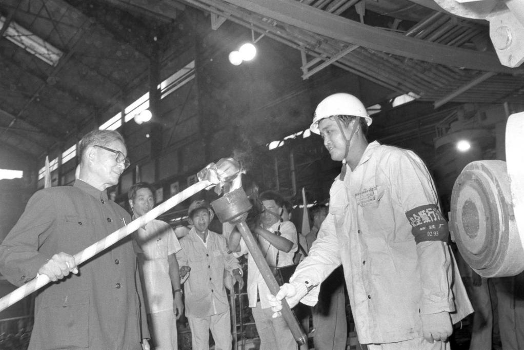 1985年9月15日,我國第一座日產(chǎn)萬噸鐵的高爐——寶鋼一號高爐點火試生產(chǎn)。這是宋平同志(左一)為高爐點火。