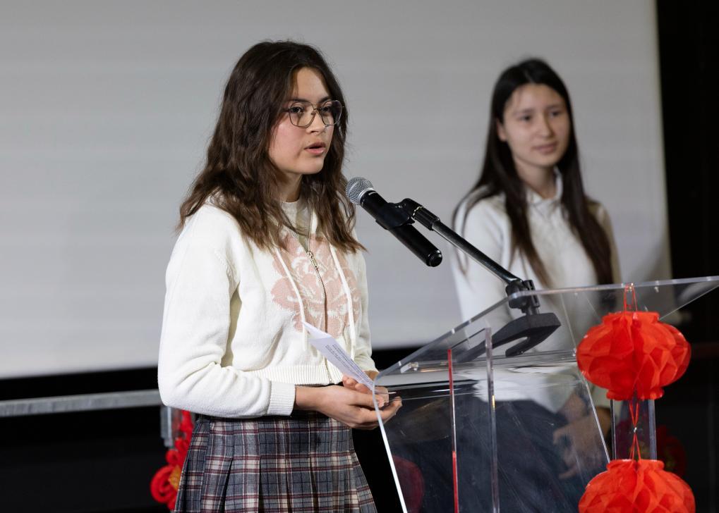 3月12日,在法國普羅旺斯-阿爾卑斯-藍色海岸大區(qū)國際學校,中國駐馬賽總領館向學校轉交習近平主席復信。這是該校中文班學生伊西絲在活動現(xiàn)場發(fā)言。新華社記者 鄔惠我 攝