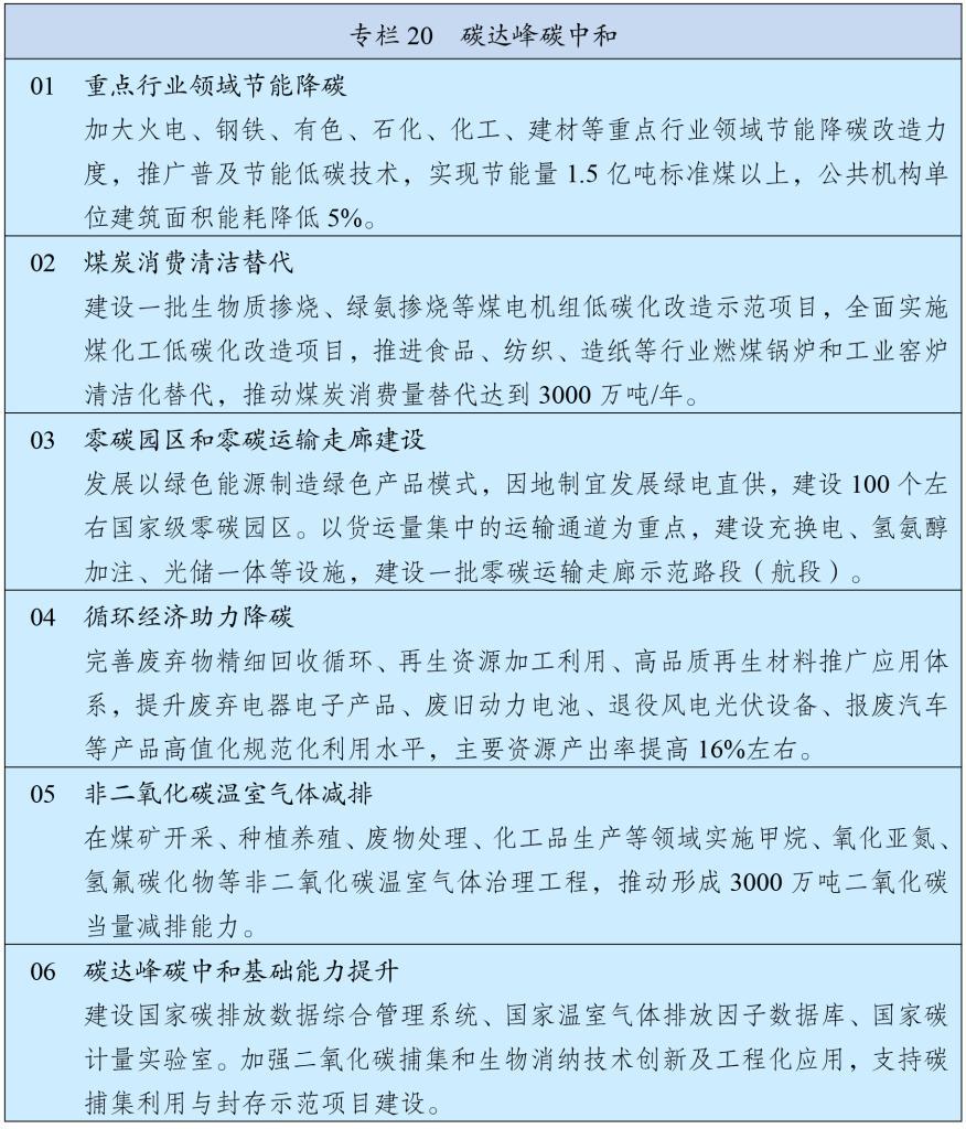 深入開展節(jié)能降碳改造和控煤減煤,加快推進(jìn)新增用電量由新增清潔能源電量覆蓋,推動(dòng)煤炭和石油消費(fèi)達(dá)峰,單位GDP能耗下降10%左右。有力有效管控高耗能高排放項(xiàng)目,加快綠色低碳技術(shù)裝備創(chuàng)新應(yīng)用,有序推動(dòng)符合要求的高載能產(chǎn)業(yè)向可再生能源資源富集區(qū)域轉(zhuǎn)移,建設(shè)零碳工廠和園區(qū)。加強(qiáng)既有建筑和市政設(shè)施節(jié)能降碳改造,促進(jìn)超低能耗和裝配式建筑規(guī)模化發(fā)展,實(shí)施制冷能效提升和綠色照明行動(dòng)。加快熱力系統(tǒng)綠色低碳轉(zhuǎn)型,因地制宜開展余熱資源利用和非化石能源供熱,有序推進(jìn)供熱計(jì)量改造和按熱量收費(fèi)。推動(dòng)交通動(dòng)力低碳替代,加快貨運(yùn)、公共領(lǐng)域電動(dòng)化和綠色燃料車船應(yīng)用,提高大宗貨物鐵路、水路運(yùn)輸比重和新能源汽車運(yùn)輸比重。提升算力設(shè)施、5G基站等新興領(lǐng)域用能效率。健全重點(diǎn)領(lǐng)域能效診斷機(jī)制,深入實(shí)施能效標(biāo)識(shí)和能效“領(lǐng)跑者”制度。深化綠色低碳高質(zhì)量發(fā)展先行區(qū)建設(shè)。