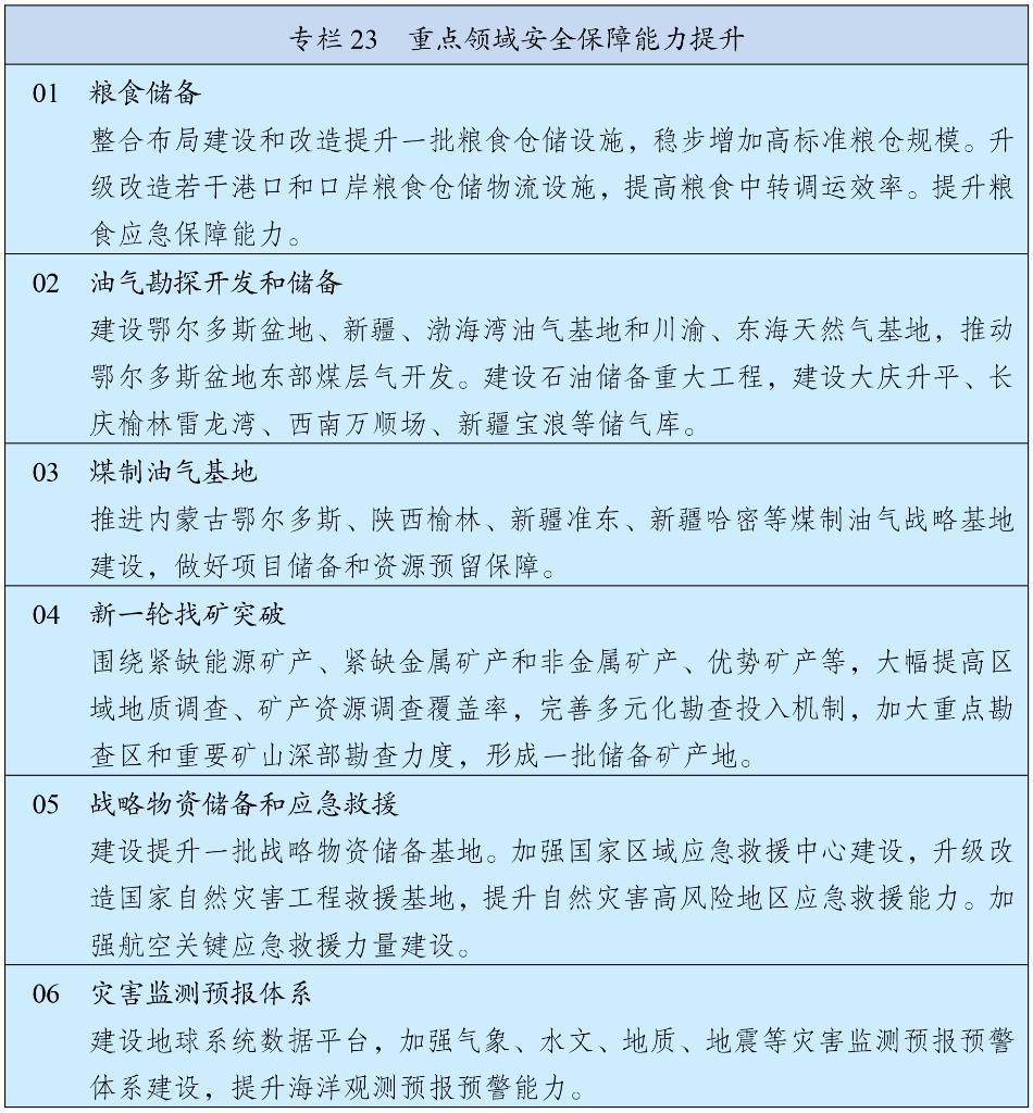 堅(jiān)持立足國內(nèi)、補(bǔ)齊短板、多元保障、強(qiáng)化儲(chǔ)備,加強(qiáng)能源產(chǎn)供儲(chǔ)銷體系建設(shè)。堅(jiān)持油氣核心需求自主保障,實(shí)施中長期油氣增儲(chǔ)上產(chǎn)戰(zhàn)略行動(dòng),確保原油年產(chǎn)量穩(wěn)定在2億噸左右、天然氣產(chǎn)量穩(wěn)步增長,加強(qiáng)煤制油氣產(chǎn)能和技術(shù)儲(chǔ)備。強(qiáng)化政府儲(chǔ)備和企業(yè)儲(chǔ)備協(xié)同,提升國家石油儲(chǔ)備規(guī)模,建立更加靈活的輪換動(dòng)用機(jī)制,增強(qiáng)天然氣儲(chǔ)備調(diào)節(jié)保障能力,完善煤炭儲(chǔ)備體系。健全能源保供中長期合同制度,完善電力應(yīng)急調(diào)度機(jī)制和備用電源配置,強(qiáng)化能源需求側(cè)管理。加強(qiáng)戰(zhàn)略性礦產(chǎn)資源勘探開發(fā)和儲(chǔ)備,深入實(shí)施新一輪找礦突破戰(zhàn)略行動(dòng),統(tǒng)籌加強(qiáng)產(chǎn)品、產(chǎn)能和產(chǎn)地儲(chǔ)備,推動(dòng)大宗商品儲(chǔ)運(yùn)基地建設(shè),提升戰(zhàn)略性礦產(chǎn)資源安全風(fēng)險(xiǎn)監(jiān)測預(yù)警和應(yīng)急保供水平。加強(qiáng)能源資源開發(fā)國際合作,維護(hù)戰(zhàn)略通道安全。