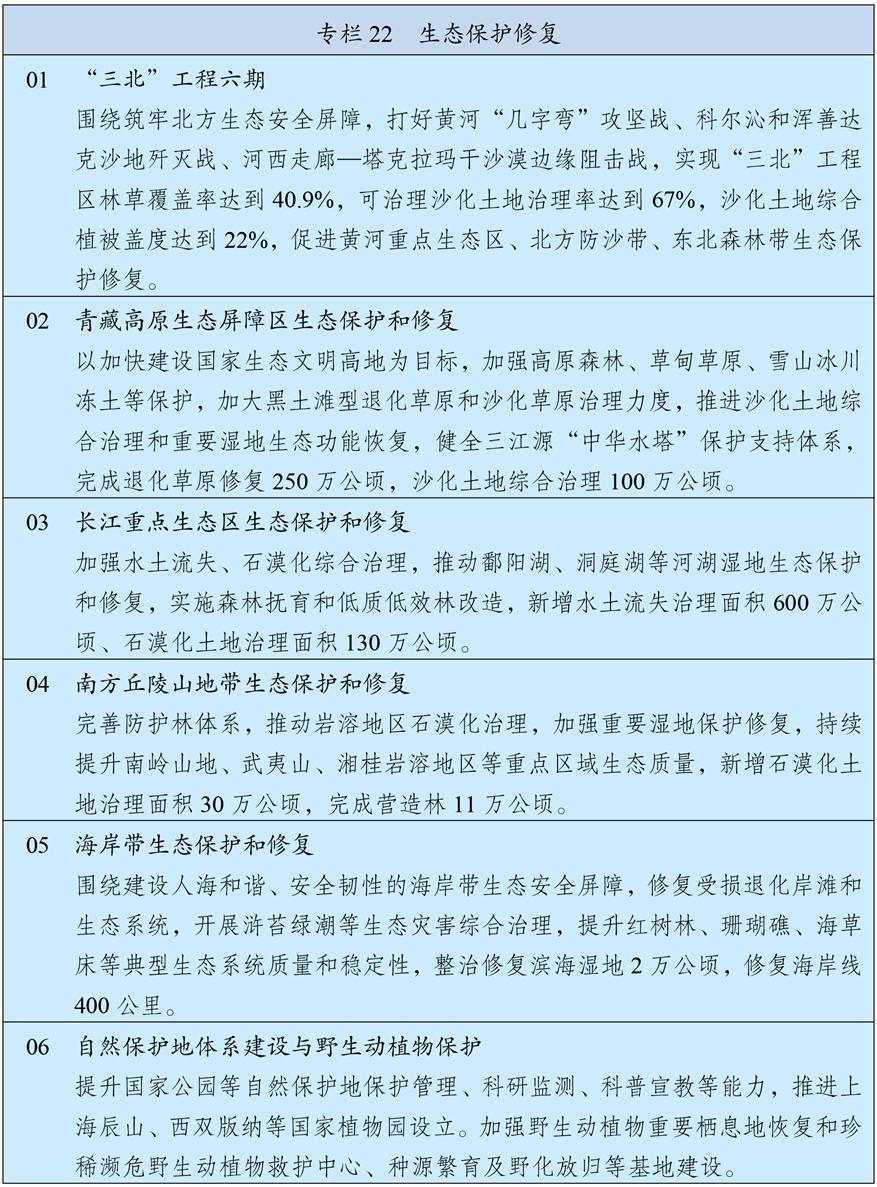 統(tǒng)籌推進(jìn)重要生態(tài)系統(tǒng)保護(hù)和修復(fù)重大工程,持續(xù)鞏固以“三區(qū)四帶”為骨架的國家生態(tài)安全屏障體系。打好“三北”工程攻堅(jiān)戰(zhàn),推動(dòng)三大標(biāo)志性戰(zhàn)役取得決定性勝利。深入推進(jìn)青藏高原生態(tài)保護(hù),加強(qiáng)重點(diǎn)區(qū)域水土流失治理和石漠化治理??茖W(xué)開展大規(guī)模國土綠化行動(dòng),推進(jìn)森林質(zhì)量精準(zhǔn)提升和國家儲(chǔ)備林建設(shè),森林蓄積量達(dá)到224億立方米,統(tǒng)籌草原生態(tài)修復(fù)與合理利用,加強(qiáng)濕地保護(hù)修復(fù)。推進(jìn)超引地表水和超采地下水治理,開展歷史遺留廢棄礦山生態(tài)修復(fù)。