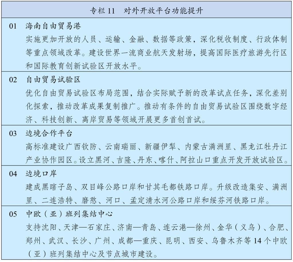 加強(qiáng)港澳與內(nèi)地經(jīng)貿(mào)、科技、人文等合作,完善便利港澳居民在內(nèi)地發(fā)展和生活政策措施。有序推進(jìn)與內(nèi)地金融市場互聯(lián)互通,深化與內(nèi)地產(chǎn)學(xué)研創(chuàng)新協(xié)同。深化粵港澳合作,持續(xù)推動(dòng)重點(diǎn)領(lǐng)域合作實(shí)現(xiàn)突破,促進(jìn)港口、機(jī)場和軌道交通協(xié)同發(fā)展,建設(shè)廣州至珠海(澳門)高鐵,推進(jìn)港深西部鐵路前期工作。深化琴澳一體化發(fā)展,高質(zhì)量建設(shè)前海、南沙、河套等重大合作平臺(tái)。建設(shè)澳門國際機(jī)場橫琴前置貨站,推進(jìn)澳琴國際教育(大學(xué))城建設(shè),支持澳門高校在橫琴延伸辦學(xué)。健全香港、澳門在國家對(duì)外開放中更好發(fā)揮作用機(jī)制,支持港澳深度參與高質(zhì)量共建“一帶一路”,發(fā)揮專業(yè)服務(wù)優(yōu)勢協(xié)助企業(yè)“走出去”。發(fā)揮港澳在中西文明交流互鑒中的重要窗口作用。